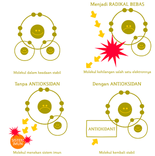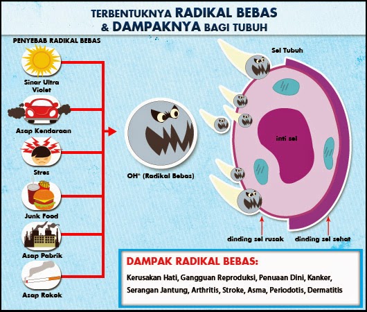 Karena ga stabil, radikal bebas mengambil elektron dari molekul lain yang menyebabkan molekul tersebut kehilangan elektronnya dan menjadi ga stabil sehingga mengambil elektron dari molekul lain. Ujung-ujungnya, jadi berantai deh. Gali lobang, tutup lobang. Siapa yang jadi korban? Sel dalam tubuh! Radikal bebas membuat sel mati. Hiks...
